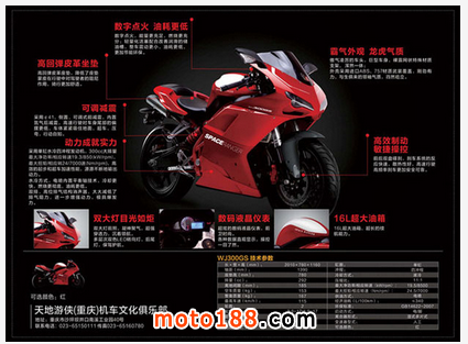 最近有幾個(gè)外國(guó)網(wǎng)站不約而同報(bào)導(dǎo)一臺(tái)型號(hào)WJ300GS的國(guó)產(chǎn)新車,車輛包圍上印有 SPACE RANGER,編者也到訪過制造商-望江摩托的官方網(wǎng)址,原來車輛的中文名字是天地游俠。為甚么外國(guó)網(wǎng)站如此關(guān)心這臺(tái)300cc的大包圍小跑,相信熟識(shí)歐 洲車的車迷無須解釋,原因是極像Ducati 1198的外型立即吸引了外國(guó)媒體的關(guān)注!