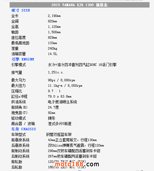 那風冷式1,251c.c.四沖程直列四汽缸DOHC 16活門引擎已經歷20年的發(fā)展,是五份一個世紀,不簡單啊!還記得初代的XJR只是1200c.c.吧,而新一代的XJR 1300壓縮比只有9.7:1,並不算高,但換來流暢而穩(wěn)定的運轉,以並非強調高出力的車子,維持98ps/8,000rpm馬力與11.1kg-m /6,000rpm扭力,令車子具有平易近人的操控性,尤其那扭力峰值十分吸引,5前速波箱是大排量車子的流行設計。