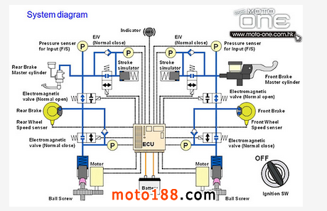 ●更仔細地顯示HONDA C-ABS全套煞車系統(tǒng),著車后車速超過6km/h及扣下煞車桿后,迫力的油壓由ECU行車電腦掌管,因此可稱為電子制動。
