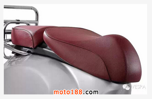 全新縫紉工藝的皮革雙鞍座椅,復(fù)古味濃烈。酒紅色皮革包裹,走線嚴(yán)絲合縫,寬大尺寸將乘坐的舒適感大大提升!新后尾燈和鍍鉻邊框,以及耀目的前鍍鉻行李架, 配合更易于清理的全新鍍鉻輪轂,與踏板中央印有的VESPA logo遙相呼應(yīng),仿佛VESPA最風(fēng)靡的60年代再現(xiàn)眼前。