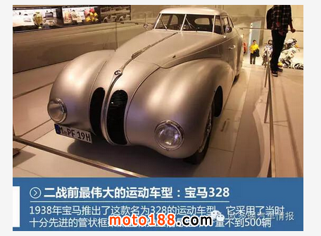寶馬328系列顯然稱得上是第二次世界大戰(zhàn)前最偉大的一款運動車,它采用十分先進的管狀框架底盤和獨立前懸掛。盡管80馬力2.0升直六發(fā)動機并不具備當時的最強性能,但由于整車的重量僅830公斤,因此這輛328依舊可以達到160km/h的最高速度,并成為二戰(zhàn)以前最快的量產(chǎn)車型。由于328的產(chǎn)量不到500輛,因此留存至今的328在拍賣會上總能以高昂的售價成交。