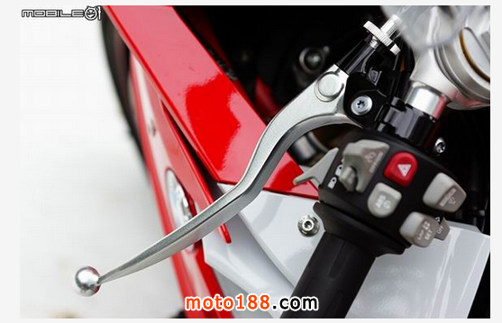 左把手部分,可以看得到鋼索離合器拉桿,以及復(fù)雜的左把手開關(guān)組;仿賽車款到目前為止大多都使用鋼索離合器,其中之一是因?yàn)殇撍麟x合器重量較油壓離合器輕一些,且鋼索離合器能從拉桿端帶給騎士最直接的離合器接合狀態(tài),讓騎士能夠更精準(zhǔn)的掌握離合點(diǎn)。