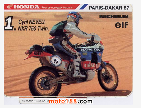 ●80年代,HONDA制造純種越野冒險(xiǎn)戰(zhàn)車(chē)NXR750V,其後制造更大排氣的NXR800V,參加全球最艱難的達(dá)卡(達(dá)客爾)拉力賽,一鳴驚人的HONDA創(chuàng)造1986-1989的4連冠神話(huà)。
