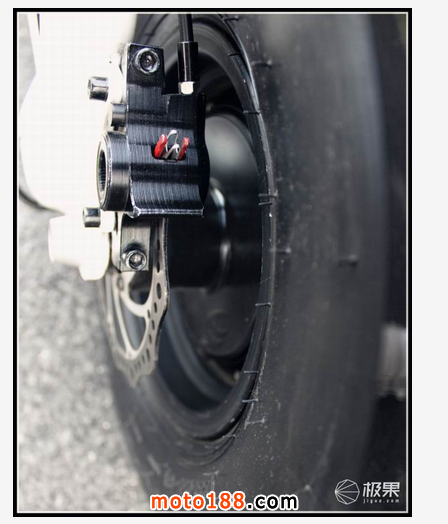 ▲后剎車夾鉗及液壓剎車管。注意,這不是傳統(tǒng)的剎車傳導(dǎo)拉繩,它是液壓油管,拆下緊固螺栓,會有剎車液流出來。