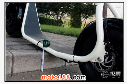 ▲如果要從這個15cm高的臺階上下來,需要先將前輪抬下,再將后輪抬下。還好,廠家在踏板地下設(shè)置了保護橫梁,托底時保護電池不受損傷。