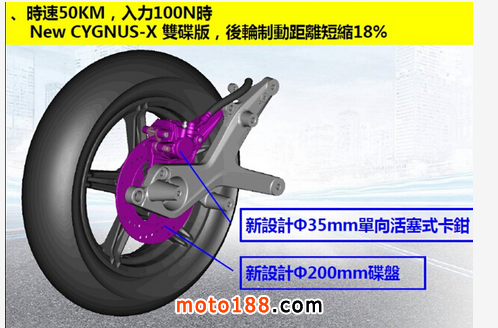 精心的改良增強(qiáng)了這新型號(hào)的起步加速和超車加速性能,但CYGNUS-X雙碟版很巧妙地以新增後碟煞所提升的制動(dòng) 力來(lái)平衡增強(qiáng)了的扭力和加速性能,且將前後煞車比例設(shè)定為兼顧安全性與運(yùn)動(dòng)性的7:3,來(lái)提升操控之安全。