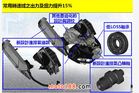 在動(dòng)力上,引擎部份以新設(shè)計(jì)凸輪軸調(diào)整進(jìn)排氣時(shí) 間,從而提升扭力輸出,無(wú)論是在一般路面或是上斜坡,新版的引擎性能表現(xiàn)都比以往優(yōu)越。