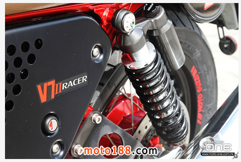 限量年產(chǎn)1000臺:每臺車架上均列明獨(dú)有限量序號,以電鍍紅色雙搖籃式車架配以黑色車身。耀目閃亮的電鍍銀色油缸上面,配置精緻烙而有MOTO GUZZ 字款的皮帶, 優(yōu)雅啡色猄皮單座位設(shè)計(jì),可調(diào)較位置的腳踏,輕量化的手把,Bitubo 可調(diào)整的避震,傳統(tǒng)鋼線轆呤,杯士軚配以傳統(tǒng)RACER 的座姿。種種不同的細(xì)節(jié)足以令V7 II RACER 成為與眾不同的車款。加上新一代六速波箱,ABS 剎車系統(tǒng)及MGCT 軌跡系統(tǒng),更加如虎潻翼。因此, V7 II RACER 是每一位電單車愛好者夢寐以求的收藏珍品。