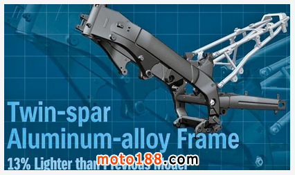 以2002款雙翼梁鋁合金跑車車架為藍(lán)本重新設(shè)計(jì)的新車架,剛性更強(qiáng)、重量更輕并融入了全新幾何結(jié)構(gòu)設(shè)計(jì)。相比老款,新后搖臂加長(zhǎng)20mm, 前軸至中軸距縮短6mm,這意味著轉(zhuǎn)向更靈活度、高速更穩(wěn)定性。前、后Kayaba(KYB)全段可調(diào)減震器,43mm倒置式長(zhǎng)行程前減震、連桿式后減震。