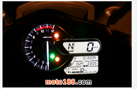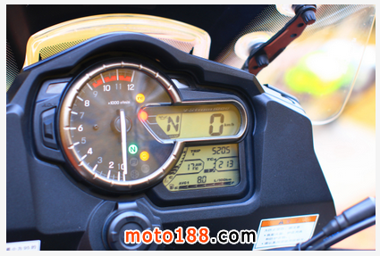 2014款V-Strom 1000的儀表板顯示信息量非常全面,超大指針式轉(zhuǎn)速表結(jié)合數(shù)顯時(shí)速表,可在不經(jīng)意間洞察速度、轉(zhuǎn)速的細(xì)微變化。TC(牽引力工作狀態(tài))、空擋、電噴自檢、低溫警示(低于3℃)、遠(yuǎn)光、檔位、機(jī)油、防凍液、TC模式選擇、大氣溫度、時(shí)鐘、防凍液溫度(量化顯示)、綜合油耗、瞬間油耗、總里程、短里程、電壓等顯示數(shù)據(jù)一應(yīng)俱全。儀表板左側(cè)為儀表控制按鍵(Reset),儀表顯示六級(jí)儀表亮度控制擁有極佳的辨識(shí)度而且科技感十足。