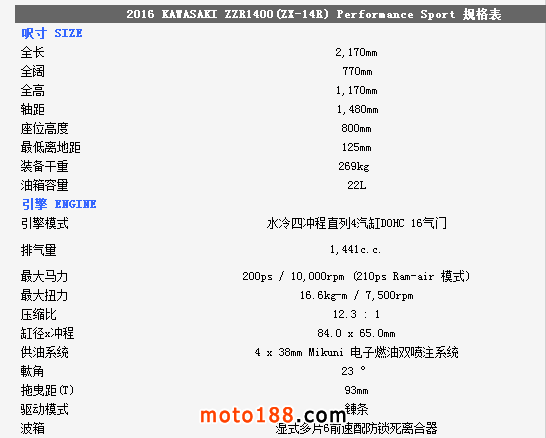 除此之外,前叉頂也由金色改用川崎綠色,並且利用雷射刻上PRELOAD(預(yù)載)英文字,圓型轉(zhuǎn)數(shù)表及速度表環(huán)也由黑色變?yōu)殂y色,座墊改用了防滑物料製造,而2016ZZR1400(ZX-14R) Performance Sport特別版亦換上新的配色與拉花。