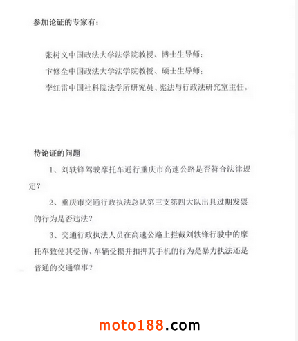 經(jīng)過中國政法大學(xué)張樹義教授、卞修全教授、中國社科院李紅雷主任的專家論證,一致認為:陳發(fā)虎作為一名高速公路執(zhí)法隊員,應(yīng)該明確知曉高速公路上的執(zhí)法規(guī)范,更應(yīng)該清楚強行攔截摩托車駕駛?cè)说膰乐睾蠊?!從?zhí)法車輛兩次連續(xù)突然并線攔截摩托車的行為及事故發(fā)生后扣押劉軼鋒手機的行為上看,高速公路執(zhí)法人員陳發(fā)虎攔截意圖是明確的,是置劉軼鋒生命安全和財產(chǎn)利益于不顧的嚴重暴力執(zhí)法行為!