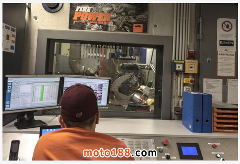 圖中所示的是KTM發(fā)動(dòng)機(jī)測(cè)試的臺(tái)架機(jī)器中的一個(gè),正在測(cè)試的是一臺(tái)LC8發(fā)動(dòng)機(jī)。這臺(tái)機(jī)器很少會(huì)用來測(cè)試發(fā)動(dòng)機(jī)的極限,而是更多的用于測(cè)試發(fā)動(dòng)機(jī)在不同工況下的噪音和針對(duì)。除此之外,發(fā)動(dòng)機(jī)的測(cè)試還包括了對(duì)不同品質(zhì)燃油進(jìn)行的測(cè)試,這也是為了保證能夠適應(yīng)全球絕大多數(shù)市場(chǎng)的油品。