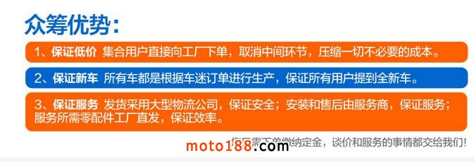 眾籌的優(yōu)勢在哪里,牛摩網(wǎng)小編特地總結(jié)了以下幾條:我們眾籌的商品,都是價格超低,而且是全新車,另外,牛摩網(wǎng)全程對物流和服務(wù)進行監(jiān)管,有問題找工廠,最大限度保證了購車用戶的利益。