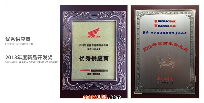 每個品牌都會在輪胎側(cè)面用LOGO的方式體現(xiàn),如下圖這個顯示的LOGO就是遠星的品牌標識,遠星也是國內(nèi)主流的品牌,和貝納利,錢江,宗申,隆鑫等都有多年的配套合作。