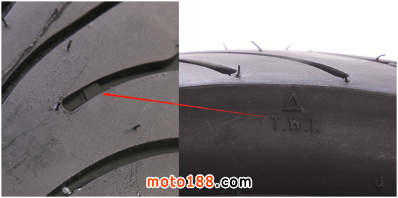 輪胎邊緣處通常有TWI標志,平行對應(yīng)到輪胎花紋里凸起的地方,就能直觀的看到磨損程度。當磨損到花紋凸起時、基本上已到達極限安全范圍,應(yīng)該及時更輪胎、避免安全隱患。