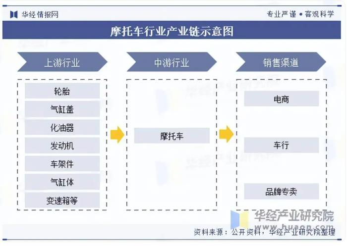 從摩托車的產(chǎn)業(yè)鏈來看,上游行業(yè)主要為的輪胎、發(fā)動機、離合器、變速器等原材料廠商,下游主要為銷售渠道,主要包括線下車行、電商以及品牌專賣店等。