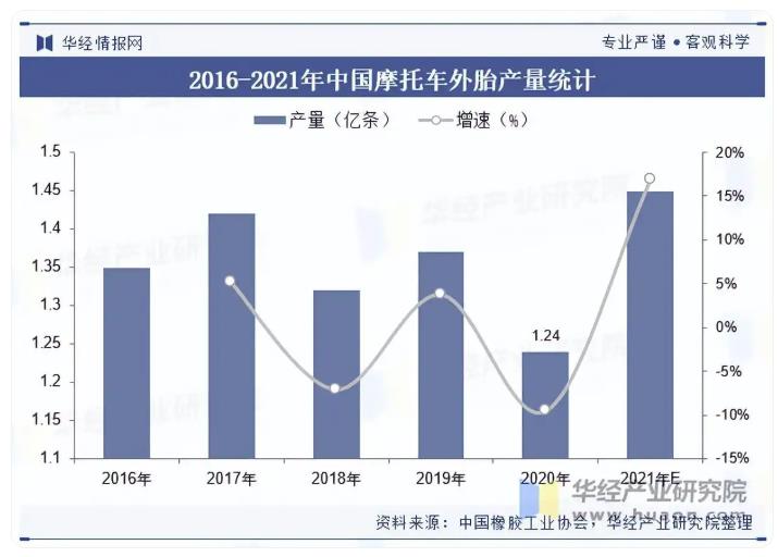2020年整體疫情導(dǎo)致出行需求下降,我國摩托車輪胎產(chǎn)量僅為1.24億條,較2019年的1.37億條下降了0.13億條,下降幅度為9.49%,據(jù)預(yù)計2021年我國摩托車外胎產(chǎn)量將超1.45億條。隨著輪胎市場的回暖,我國摩托車行業(yè)的發(fā)展將得到有力的支撐。