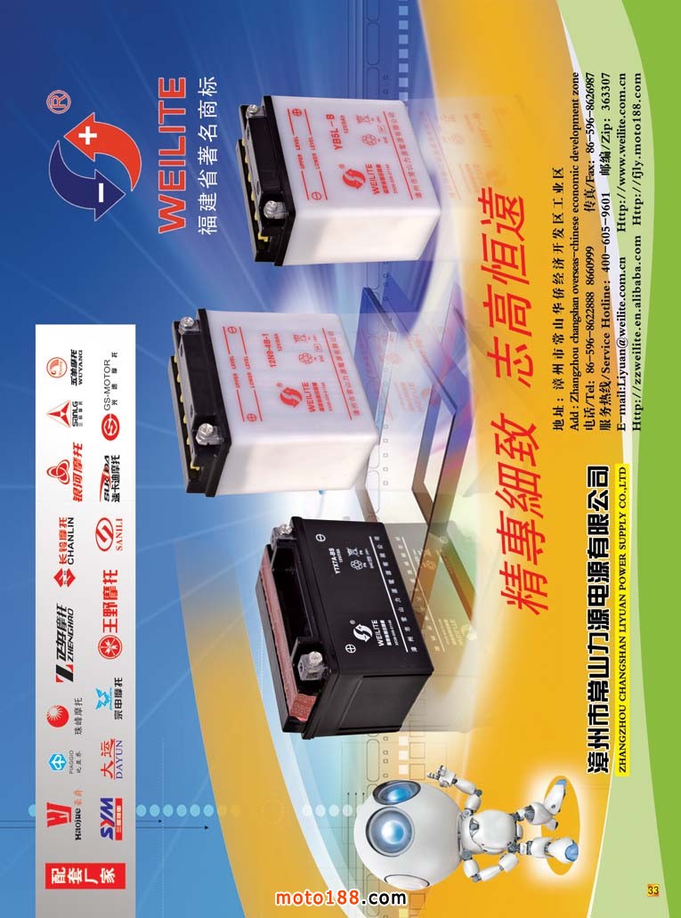 這一期是電池的專題,是摩托車和電動車都必須要用的重要部件。我們從龐雜的資料中精選了十四頁內(nèi)容,其中有一篇是由企業(yè)提供的稿件。我們歡迎企業(yè)能踴躍投稿,將你們的技術(shù)和經(jīng)驗(yàn)與行業(yè)共同分享,提升行業(yè)整體素質(zhì),同時(shí)也可以通過我們這個(gè)平臺來提升企業(yè)的知譽(yù)度。