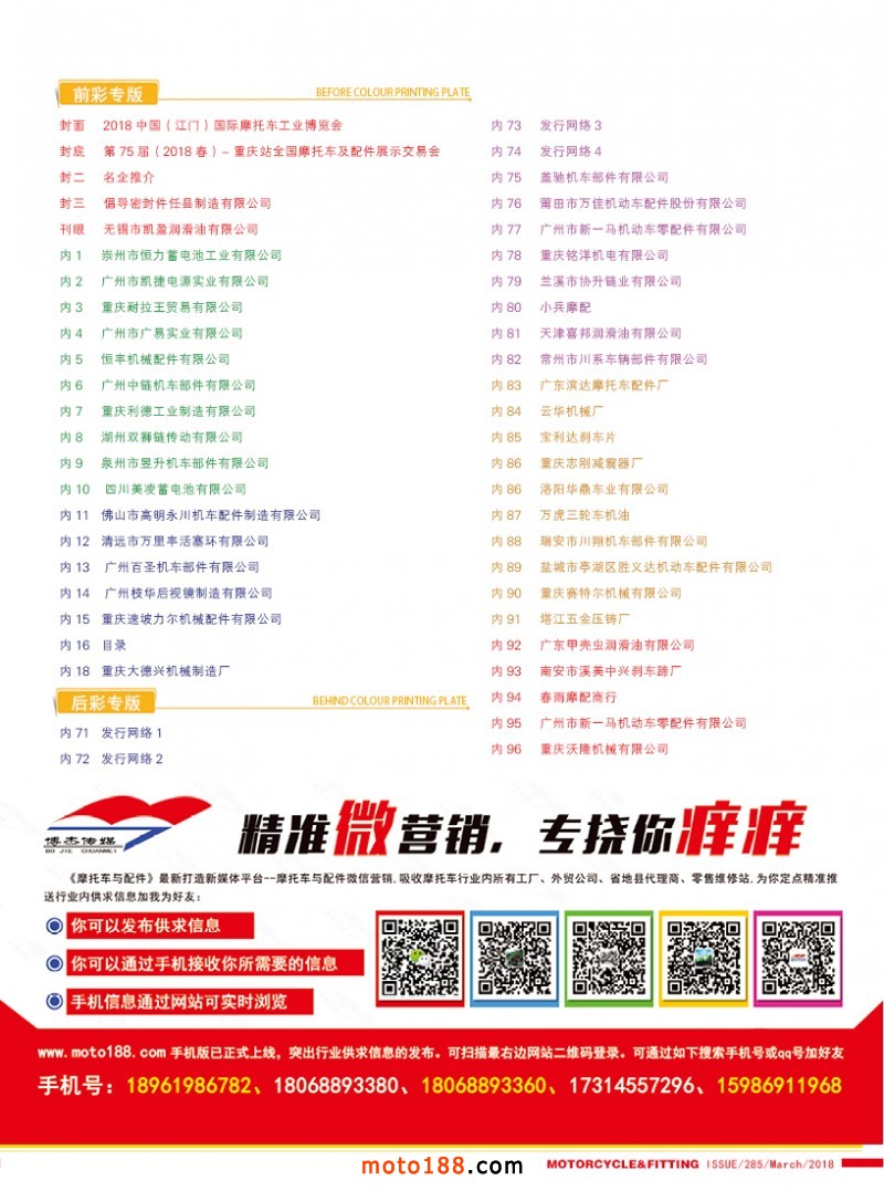 《摩托車與配件》傳統(tǒng)媒體與新媒體的結(jié)合,以及我們腳踏實地的工作。這一年多來,雜志已經(jīng)華麗的轉(zhuǎn)身,并且拓展出新的發(fā)展空間,可為摩配行業(yè)企業(yè)提供更多的服務(wù)形式。目前我們己基本將全行業(yè)的從業(yè)人員加為微信好友,為國內(nèi)外貿(mào)企業(yè)建了四個群,同時又建國內(nèi)五大市場群,方便了業(yè)務(wù)開展和企業(yè)互動;完成了對全國市場的新一輪的走訪,對國內(nèi)摩配市場有了一個全面的準(zhǔn)確的認識;完成了對目前現(xiàn)有摩配生產(chǎn)廠家的資料更新。2017我們蓄勢待發(fā),2018我們揚帆起航!