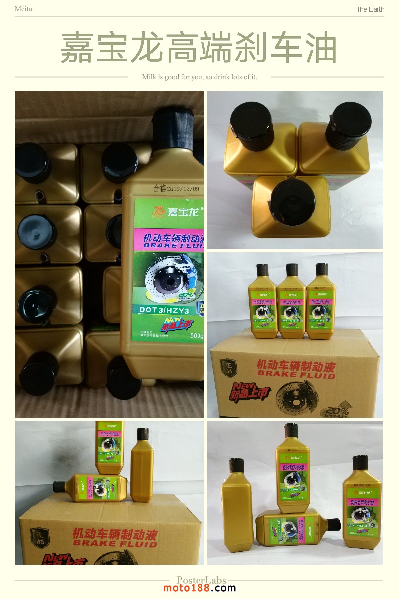 3、綠色瓶身黑色蓋子嘉寶龍中文版碟剎車油:國標DOT3,適用于所有的摩托車、電動車、自行車等低速、低溫車,比市場上大部分碟剎油能更好的保護碟剎泵和碟剎系統(tǒng),讓行車制動靈敏,經(jīng)久耐用。