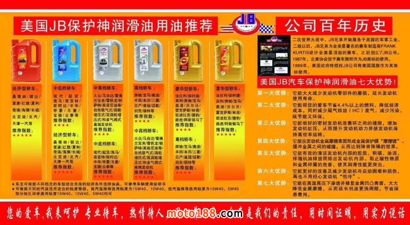 強(qiáng)勁動(dòng)力、節(jié)省燃油、降低噪音一一美國(guó)JB汽車、摩托車潤(rùn)滑油招商熱線:13983085378,期待您的加入,共創(chuàng)財(cái)富!