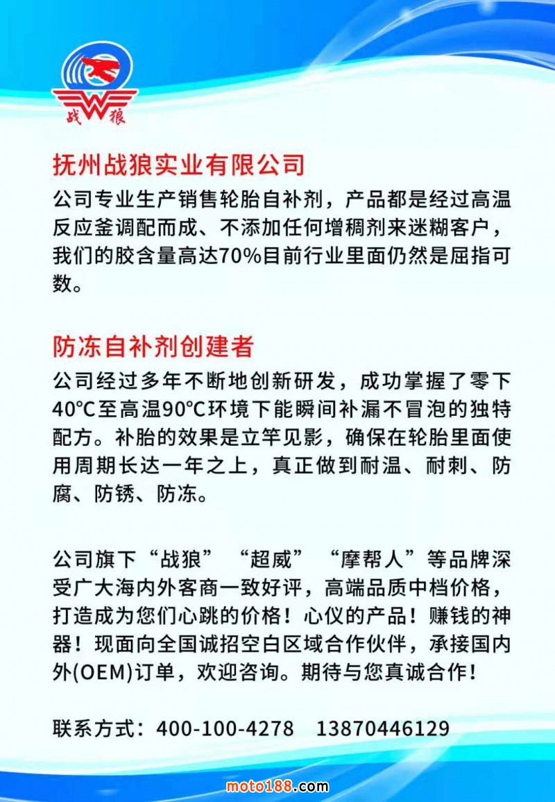 【撫州戰(zhàn)狼實業(yè)有限公司】公司專業(yè)生產(chǎn)銷售輪胎自補劑,產(chǎn)品都是經(jīng)過高溫反應(yīng)釜調(diào)配而成、不添加任何增稠劑來迷糊客戶,我們的膠含量高達70%目前行業(yè)里面仍然是屈指可數(shù)。【防凍自補劑創(chuàng)建者】公司經(jīng)過多年不斷地創(chuàng)新研發(fā),成功掌握了零下40℃至高溫90℃環(huán)境下能瞬間補漏不冒泡的獨特配方。補胎的效果是立竿見影,確保在輪胎里面使用周期長達一年之上,真正做到耐溫、耐刺、防腐、防銹、防凍。