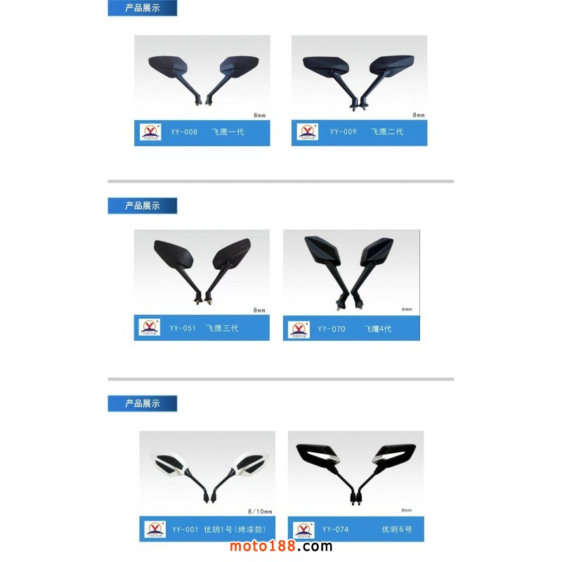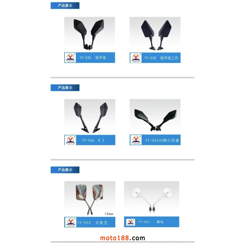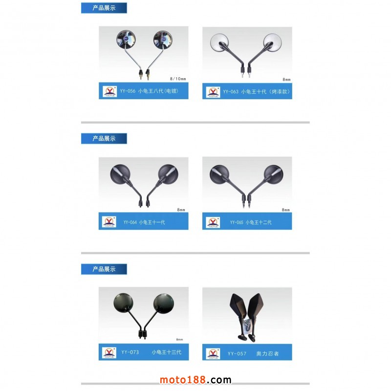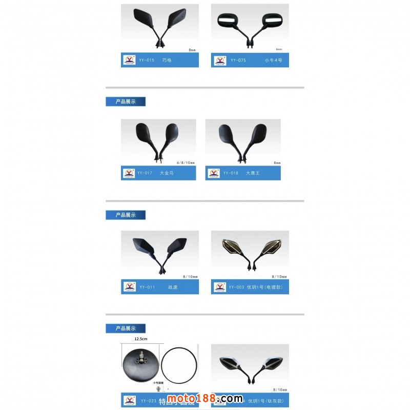 【溫州優(yōu)玥機車部件有限公司】專業(yè)生產(chǎn)電動車、摩托車后視鏡。我們本著質(zhì)量第一、誠信為本、合作雙贏的理念,真誠的與各位老板合作。聯(lián)系電話:15397338877(微信同號)。