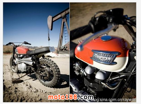 這輛以Triumph Scrambler為改裝基礎(chǔ)車的Trophy 55,整個(gè)改裝工程交由米國(guó)當(dāng)?shù)氐腏omo Racing所操刀,除了承襲Scrambler的風(fēng)格之外,但經(jīng)過(guò)不少部件的更換,如換上Desert Fox越野車把、排氣管、特殊訂制的鋁合金前號(hào)碼牌與投射式大燈、前后擋泥板、油箱支架與油箱上的Trophy 55專用銘牌等等。而在車架的電瓶護(hù)蓋上,改裝廠則還把Bud Ekins歷年來(lái)贏得冠軍的全部標(biāo)示出來(lái)!
