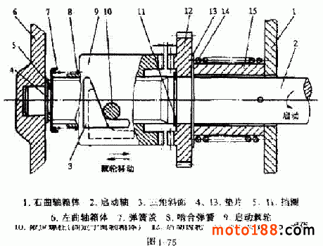 啟動棘輪在轉(zhuǎn)動過程中,三角斜面與限位螺柱的相對位置發(fā)生變化,在嚙合彈簧的作用下,啟動棘輪便向右移動。當(dāng)啟動軸轉(zhuǎn)動到一定角度時,啟動棘輪棘齒便完全與啟動齒輪左側(cè)面上的棘齒嚙合,從而帶動啟動齒輪轉(zhuǎn)動,啟動發(fā)動機。發(fā)動機啟動以后,啟動軸失去外力(踏動啟動蹬桿的力)作用,便在回位彈簧的作用下,順時針轉(zhuǎn)動。啟動棘輪隨之順時針轉(zhuǎn)動,并在限位螺柱作用下,向左移動,脫開與啟動齒輪的嚙合。