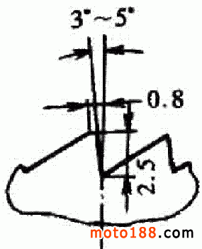 啟動打滑,是啟動齒輪與啟動棘輪棘齒嚙合不牢而產(chǎn)生的一種現(xiàn)象。其產(chǎn)生的原因如下:一、棘齒磨損如圖 1-76 所示,啟動齒輪和啟動棘輪的棘齒,約有 3° ~ 5° 的斜角,齒高只有 2.5mm 。棘齒磨損后,斜角變大,齒高變小,嚙合時的接觸面積減小,便會產(chǎn)生嚙合不牢的現(xiàn)象。