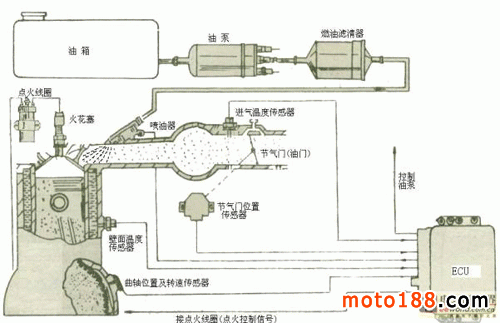 油泵為發(fā)動機(jī)提供充足的燃油量,并且保持足夠的油壓,使得在所有的工況下噴油器都能夠進(jìn)行有效的燃油噴射。調(diào)壓器保持油管內(nèi)的常壓,這樣就可以通過改變噴油器的開啟和結(jié)束時(shí)間來精確計(jì)量燃油量。點(diǎn)火鑰匙接通電源時(shí),電控系統(tǒng)就開啟油泵,提供第一次噴射所需的燃油壓力。只要點(diǎn)火鑰匙接通電源且發(fā)動機(jī)運(yùn)轉(zhuǎn)著,油泵就始終運(yùn)轉(zhuǎn)工作。
