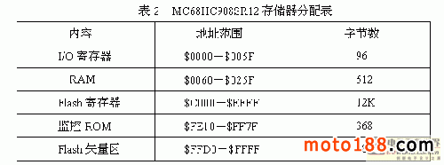 MC68HC908SR12可尋址64KB地址空間,主要包括:12KB的閃速存儲器Flash、512字節(jié)的隨機(jī)存儲器RAM、48字節(jié)的用戶定義矢量區(qū)和368字節(jié)的監(jiān)控ROM,存儲器的具體分配情況如下表: