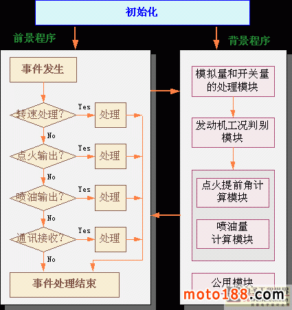 為了能夠滿足實(shí)時(shí)控制的要求,電控軟件將采用“前景/背景”結(jié)構(gòu)進(jìn)行設(shè)計(jì),即將轉(zhuǎn)速信號的捕捉處理以及點(diǎn)火、噴油信號等的輸出作為“前景”,這些實(shí)時(shí)性要求高的處理過程會立即得到主芯片的響應(yīng),而前景程序執(zhí)行所需要的各種參數(shù)的計(jì)算以及其他實(shí)時(shí)性要求不高的部分,則在由主循環(huán)等待及實(shí)時(shí)中斷所組成的“背景”中進(jìn)行。