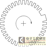 轉(zhuǎn)速處理模塊的軟件示意框圖如圖4所示。轉(zhuǎn)速脈沖信號是由發(fā)動機(jī)曲軸位置及轉(zhuǎn)速傳感器獲得的,由于傳感器的觸發(fā)盤(如圖5所示)有一個不同于其它的大齒,因此,觸發(fā)盤轉(zhuǎn)動一周所產(chǎn)生的脈沖信號中也存在一個寬度較大的脈沖。利用這一點(diǎn),將此脈沖信號經(jīng)過軟件的處理之后,不僅可以用來提供發(fā)動機(jī)工況所需的轉(zhuǎn)速,還將提供電控系統(tǒng)工作所需的曲軸位置信息,從而按照發(fā)動機(jī)時(shí)序控制的要求在確定的曲軸轉(zhuǎn)角處實(shí)現(xiàn)點(diǎn)火和噴油輸出。
