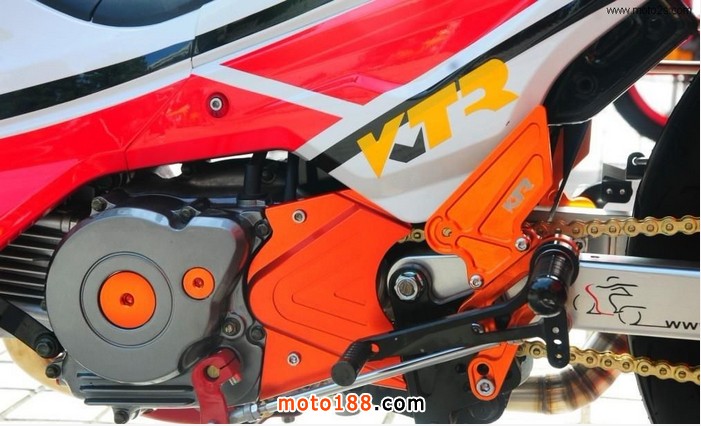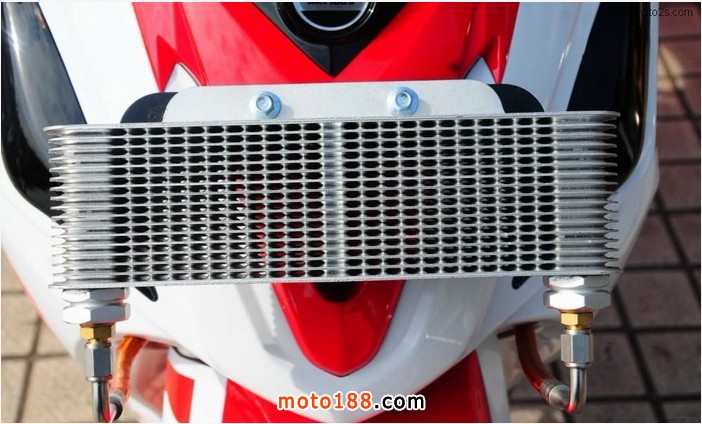 在性能方面,KTR選用了機油冷卻器來保證發(fā)動機持續(xù)高溫狀態(tài)下的良好表現(xiàn),同時,最為搶眼的莫過于一根手工焊接排氣管了,精細的工藝、夸張的全段直通排氣,仿佛看到它的時候就聽見了GP賽場上那震耳欲聾的澎湃氣浪!該車的前后減震均做了更換,而該車的后減震更是由一家臺灣高檔摩托車減震生產(chǎn)企業(yè)為K8量身打造而成的,用料十足,做工講究。