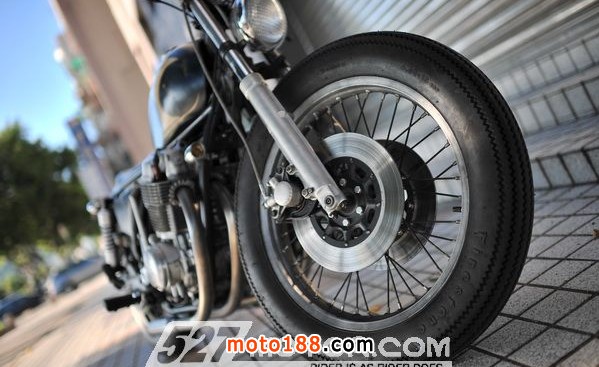 不過為了營造出當(dāng)年的老味,輪圈還是被改成F1車型的輻條圈,且配上胎壁飽滿的Firestone Deluxe Champion復(fù)刻胎,尺碼為前4.00-19、后4.50-18。車高方面則是先為前叉內(nèi)管切短,之后再為后避震器換上長度僅280mm的改裝品。