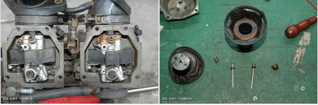 拆開(kāi)一看,膜穿孔了,油針卡簧還少一個(gè),用個(gè)鐵絲卡在上面,混合氣絲還是擰不動(dòng),哪個(gè)孔又很深,也看不到里面的狀態(tài)。