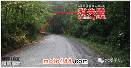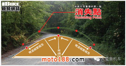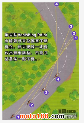 當(dāng)「消失點(diǎn)」開(kāi)始偏離中間點(diǎn),游向視野兩旁時(shí),表示人車(chē)開(kāi)始接近彎道?!赶c(diǎn)」越向旁邊移動(dòng),代表彎道越急。當(dāng)「消失點(diǎn)」移向中間時(shí),代表接近彎道出口,在應(yīng)付連續(xù)的陌生彎道時(shí),我們只要依隨著以下的原則,對(duì)應(yīng)著「消失點(diǎn)」的變化便可提升攻彎的流暢度: