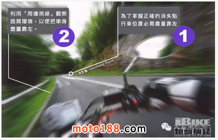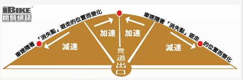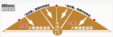 如果入彎前的車(chē)速是在駕駛者所能應(yīng)付的能力之內(nèi)的話,「消失點(diǎn)」會(huì)和駕駛者穩(wěn)定地保持著一定的距離,大部份情況都會(huì)是兩、三個(gè)車(chē)位的距離。但若果駕駛者的轉(zhuǎn) 向能力未能及時(shí)消化彎道的變化時(shí),「消失點(diǎn)」便會(huì)急速地向駕駛?cè)说姆较蚩拷?,代表入彎速度過(guò)高,超出騎士本人的轉(zhuǎn)向能力,減速是唯一辨法,否則人車(chē)恐怕會(huì) 沖出彎道之外.....