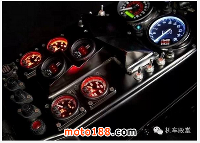 金屬置地的儀表盤放置在油箱上部,這一點(diǎn)和B組的拉力車很相似。方便讀取溫度,油壓,速度,轉(zhuǎn)速和電壓。線路都包裹在機(jī)身周圍,猶如金蛇纏繞。