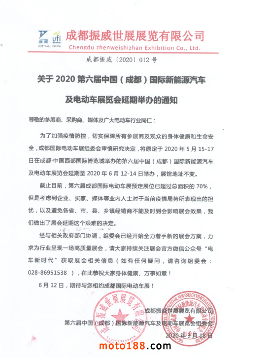 因新型冠狀病毒疫情的影響,全國各省市及自治區(qū)均已啟動一級響應(yīng)預(yù)案,要求取消或延期舉辦各類大型公眾活動。為了堅決貫徹落實黨中央、國務(wù)院關(guān)于應(yīng)對疫情防控工作部署和四川省、成都市相關(guān)工作要求,根據(jù)四川省應(yīng)對新型冠狀病毒感染的肺炎疫情應(yīng)急指揮部第2號公告中有關(guān)疫情防控期間暫停一切群體性聚集活動的通知精神,切實保障所有參展人員的身體健康和生命安全,組委會決定將原定于2020年5月15-17日在中國西部國際博覽城舉辦的第六屆成都國際電動車展延至2020年6月12-14日舉辦。