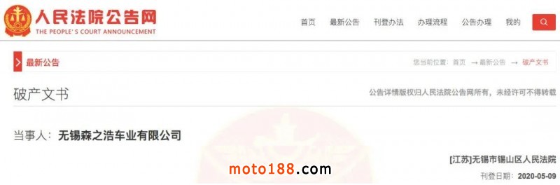 據(jù)人民法院公告網(wǎng)公布,無錫巴山車業(yè)有限公司、無錫森之浩車業(yè)有限公司于最近破產清算。