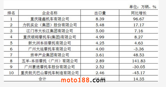 2015年1月摩托車(chē)生產(chǎn)企業(yè)出口量排名(TOP 10)