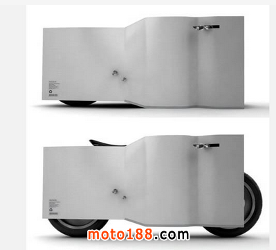 原子概念摩托車。創(chuàng)意簡(jiǎn)單單新穎。用時(shí)將輪子拉出,座位升起即可