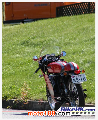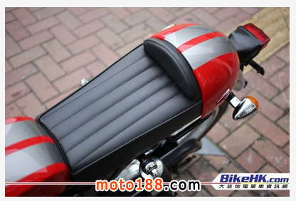 一如當年的GP跑車,77的車身擾流用上圓潤的線條。車頭加入了圓頭燈,與其它部位的圓潤互相呼應(yīng)。擾流的款式亦充滿復(fù)古味道,沒有硬朗的骨位,亦沒有任何導(dǎo)風槽,上下兩幅擾流一氣呵成。油缸的款式長而窄,但也有13公升的容量。紅色油缸上可以找到銀色賽車線條。車頭配上傳統(tǒng)的正立前叉,車尾用雙彈簧避震。排氣設(shè)在車身右邊,啞黑色的尾鼓是最簡樸的圓錐形。車頭的制動用上單碟剎,車尾是機械鼓剎。儀表采用小巧的款式,只有指針及一行警示燈,不設(shè)LCD屏。車速表上的刻度以160km/h為終結(jié),而轉(zhuǎn)數(shù)表則在約7500rpm列入紅區(qū)。77配上的是五前速波箱,配合了整體的風格。座鞍的線條一如油缸般長而窄,眼前的77并不是單座型號,因為車身本來就已經(jīng)有后座腳踏。座鞍上的是單座蓋,拆下之后就變回雙騎。前后沙板的款式亦十分懷舊,再加上把手尾的后鏡就更加有韻味。當然,鋼線輪圈配內(nèi)膽輪胎,也是貫徹到底的復(fù)古。。