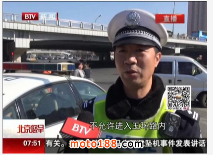 之后北京公安局公安交通管理局豐臺(tái)交通支隊(duì)方莊隊(duì)的執(zhí)法警官昝玉貴同志,在接受媒體采訪時(shí)說(shuō)京B號(hào)牌摩托車(chē),不允許進(jìn)入五環(huán)路內(nèi)。