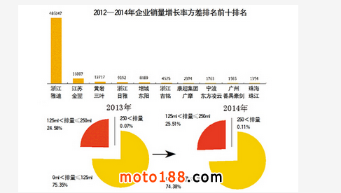 從各排量區(qū)間的銷(xiāo)售占比來(lái)看,250排量以上的摩托車(chē),2014年銷(xiāo)量占比為0.11,同比2013年上漲0.04%.