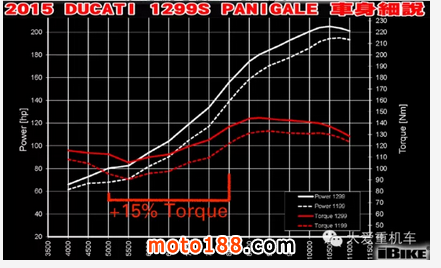 先說說引擎,Engine由1198cc撥大到1285cc,個piston bore比1199大了4mm到116mm,壓縮比是12.6:1,而這幅引擎要用上全新設(shè)計的活塞,Liner,新曲軸,新連桿。結(jié)果1299得出的馬 力是205匹,大1199差不多10匹,杻力145Nm,也比1199大10多Nm。