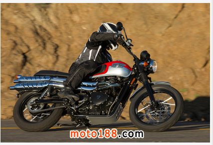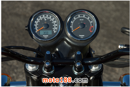 從Ducati與Triumph對比研究。凱旋感覺舒適寬敞,包容和寬松相比,特別是與乘客; 長雙乘坐起來相當過癮這種摩托車。然而,對于運動騎它的馬力,靈活性和前制動感覺就不能和現(xiàn)在的車種相比較。但正如我們花更多的時間在我們長大習慣的改變坐姿; 雖然落后一點的剪切和推力騎相比Ducati,凱旋高高聳立在它自己的優(yōu)點。其59.0英寸的軸距,28度轉(zhuǎn)向耙和517磅的濕重全部加起來更大,感覺一個更重要的沉著和隨和的性質(zhì)。盡管其較低的52.8馬力的峰值,仍然有足夠的扭矩在手的樂趣并在865cc的270度的曲柄,風冷,八閥門廠與5速變速箱使發(fā)動機人物和引人入勝的感覺。